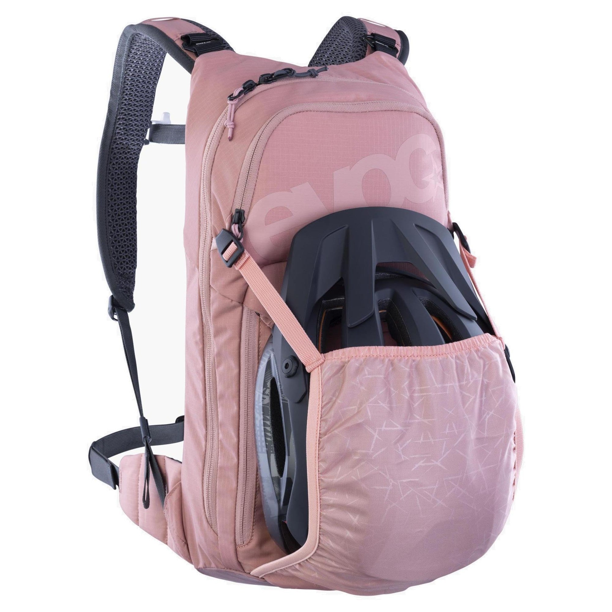 A compact and lightweight cycling backpack in dusty pink, specifically designed for mountain bikers and convincing with thoughtful functionality.