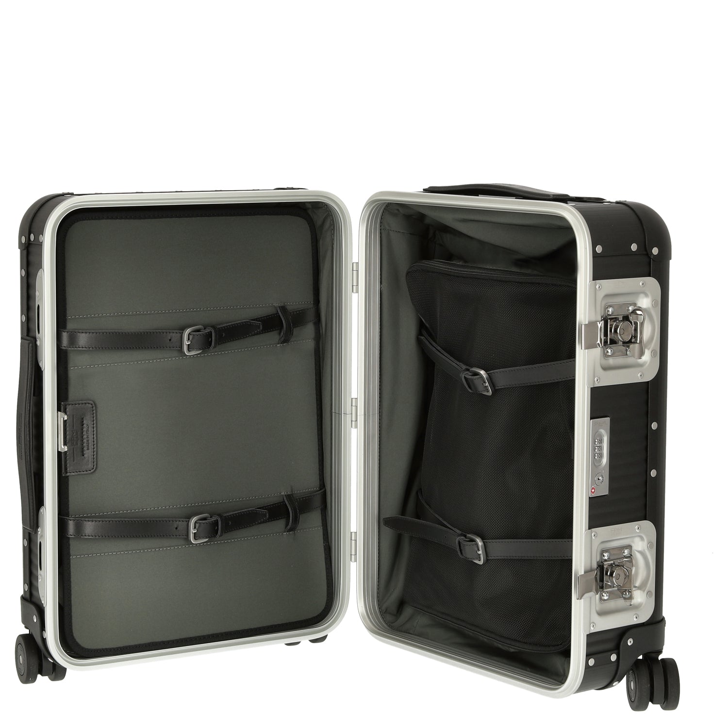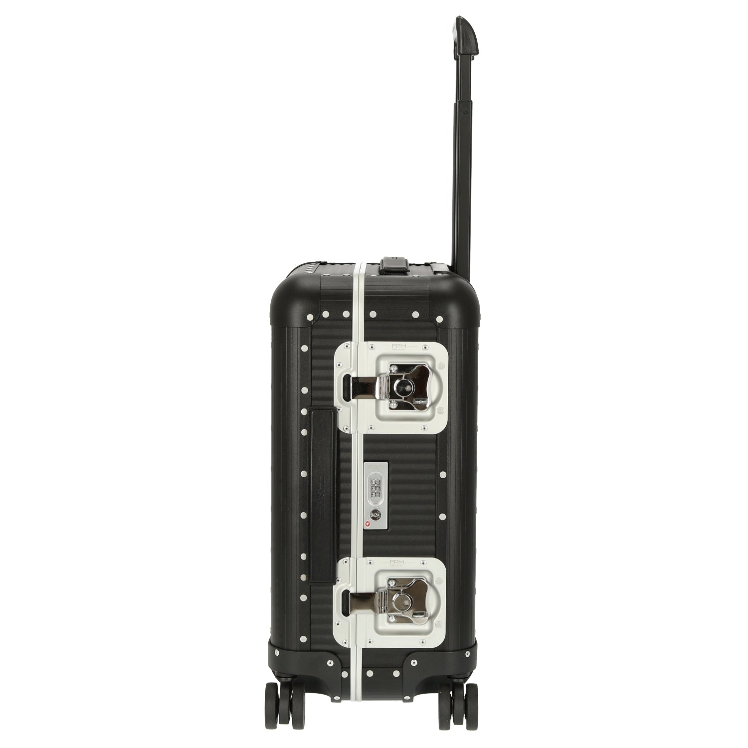 The FPM Bank Spinner 55 M Aluminum in Caviar Black combines timeless design and practical functionality, allowing you to travel stylishly and organized.