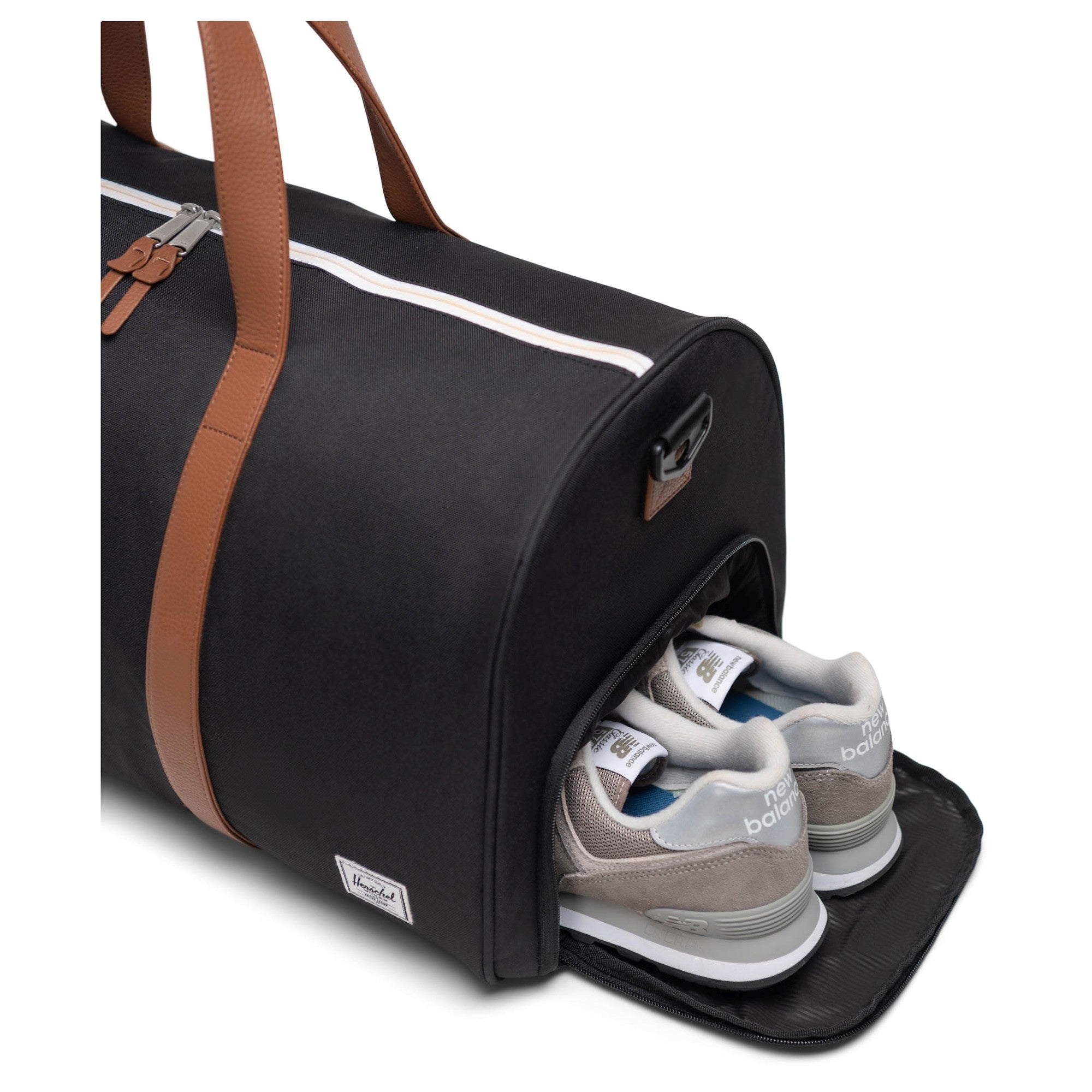 The Herschel Novel travel bag in black combines a robust design with sustainable material use and offers thoughtful functionality for versatile travel needs.