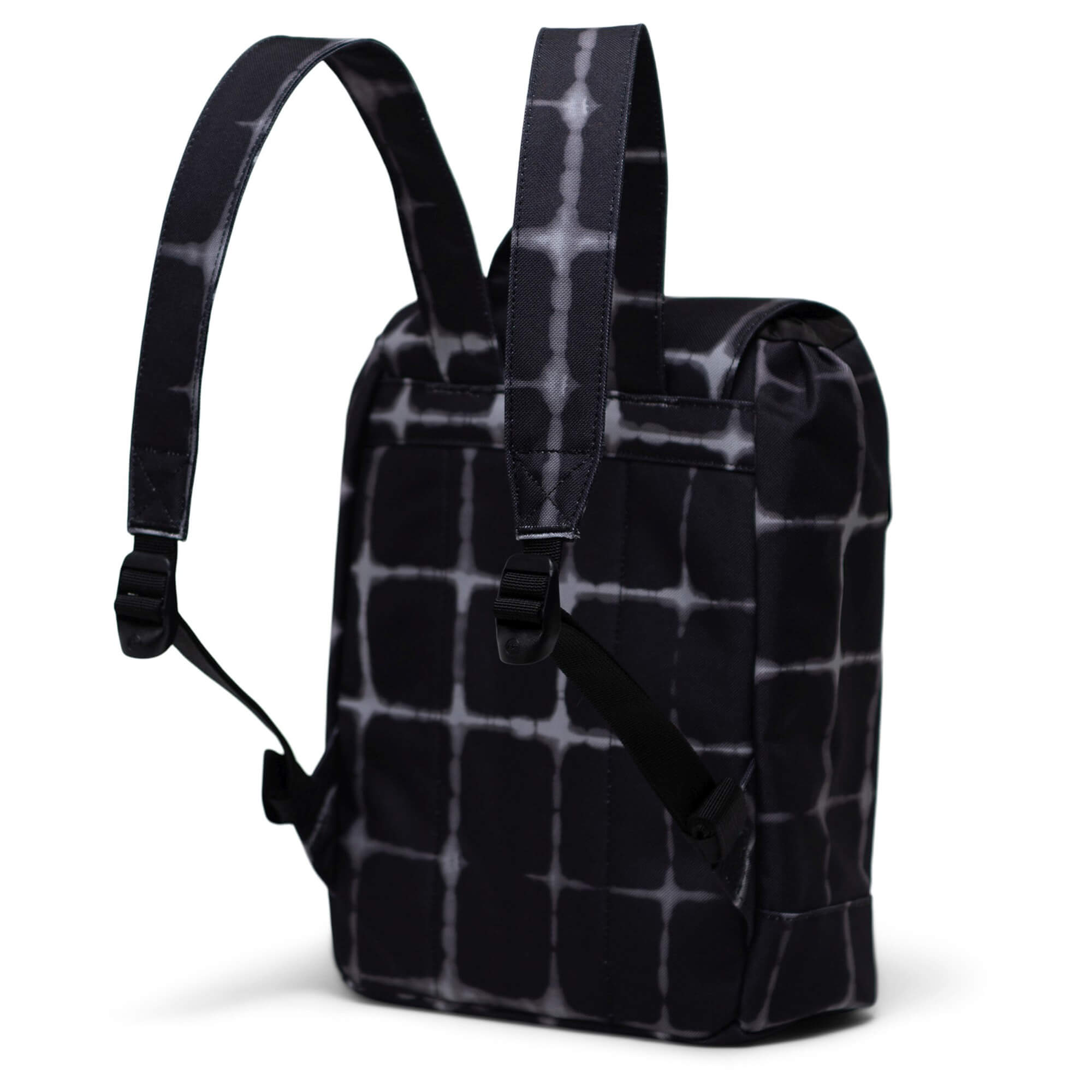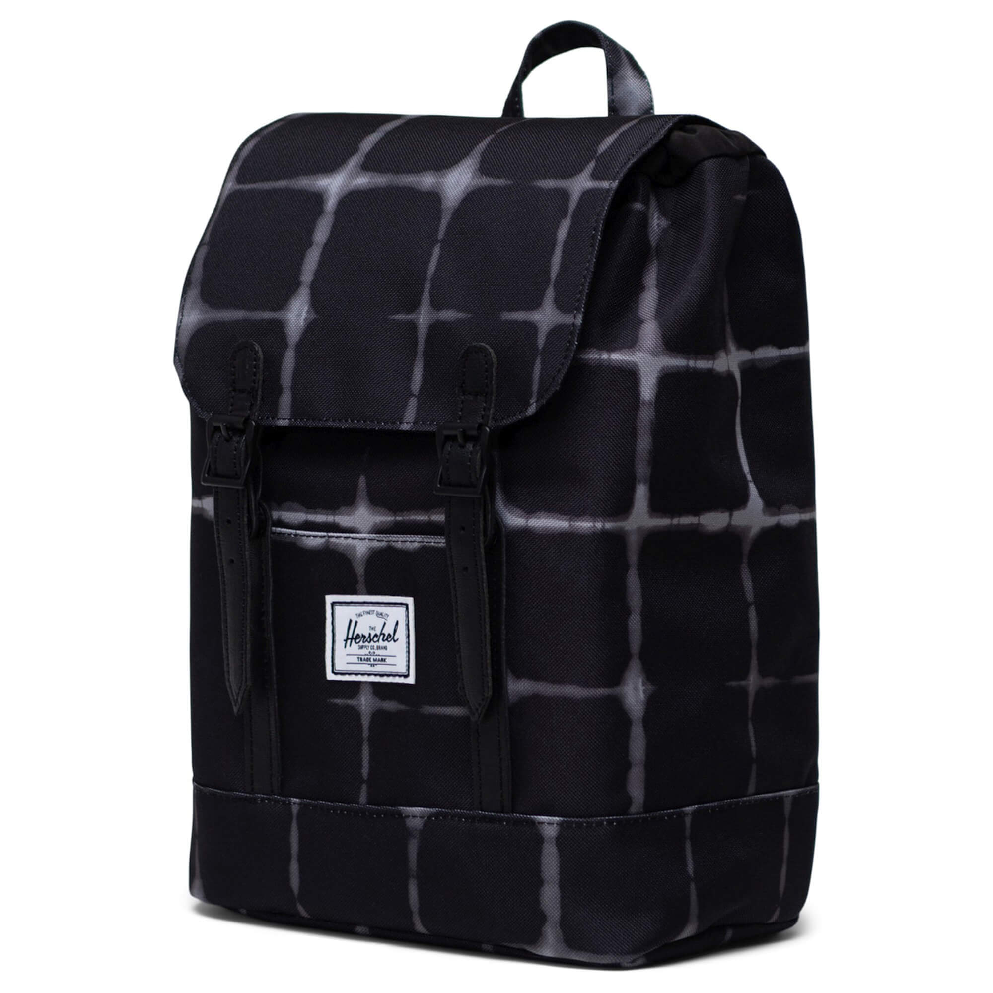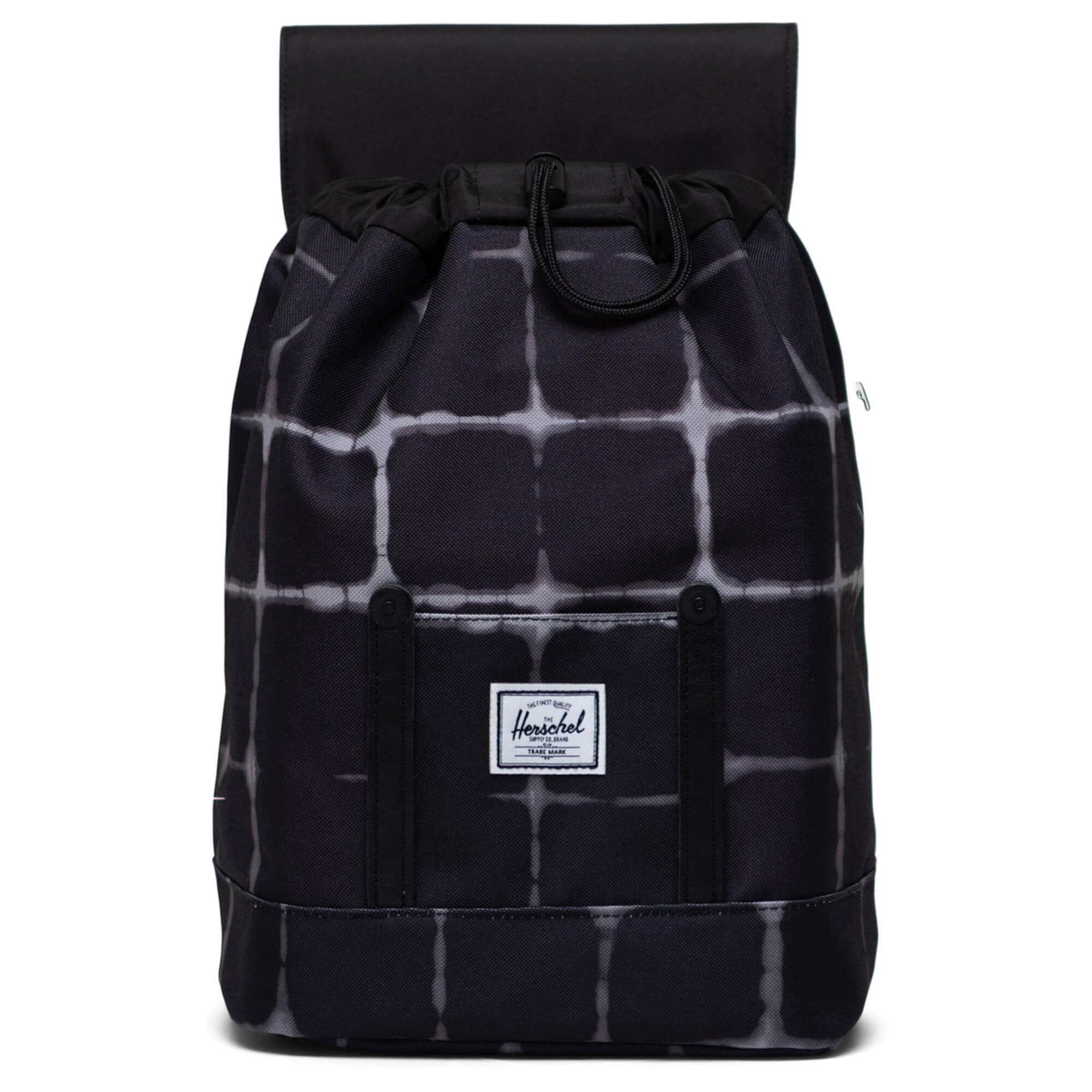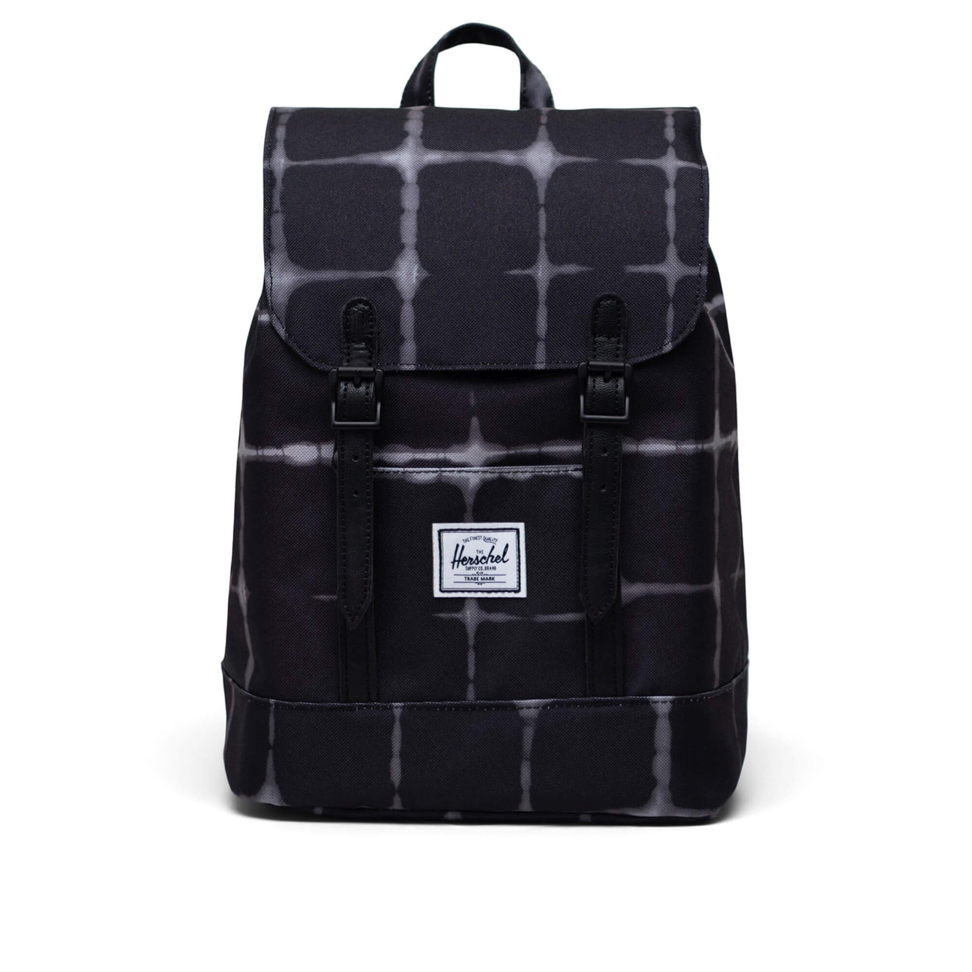 The Herschel Retreat Mini backpack features a classic, compact silhouette in fashionable Tie Dye Check Black, ideal for relaxed days in the city or going out.