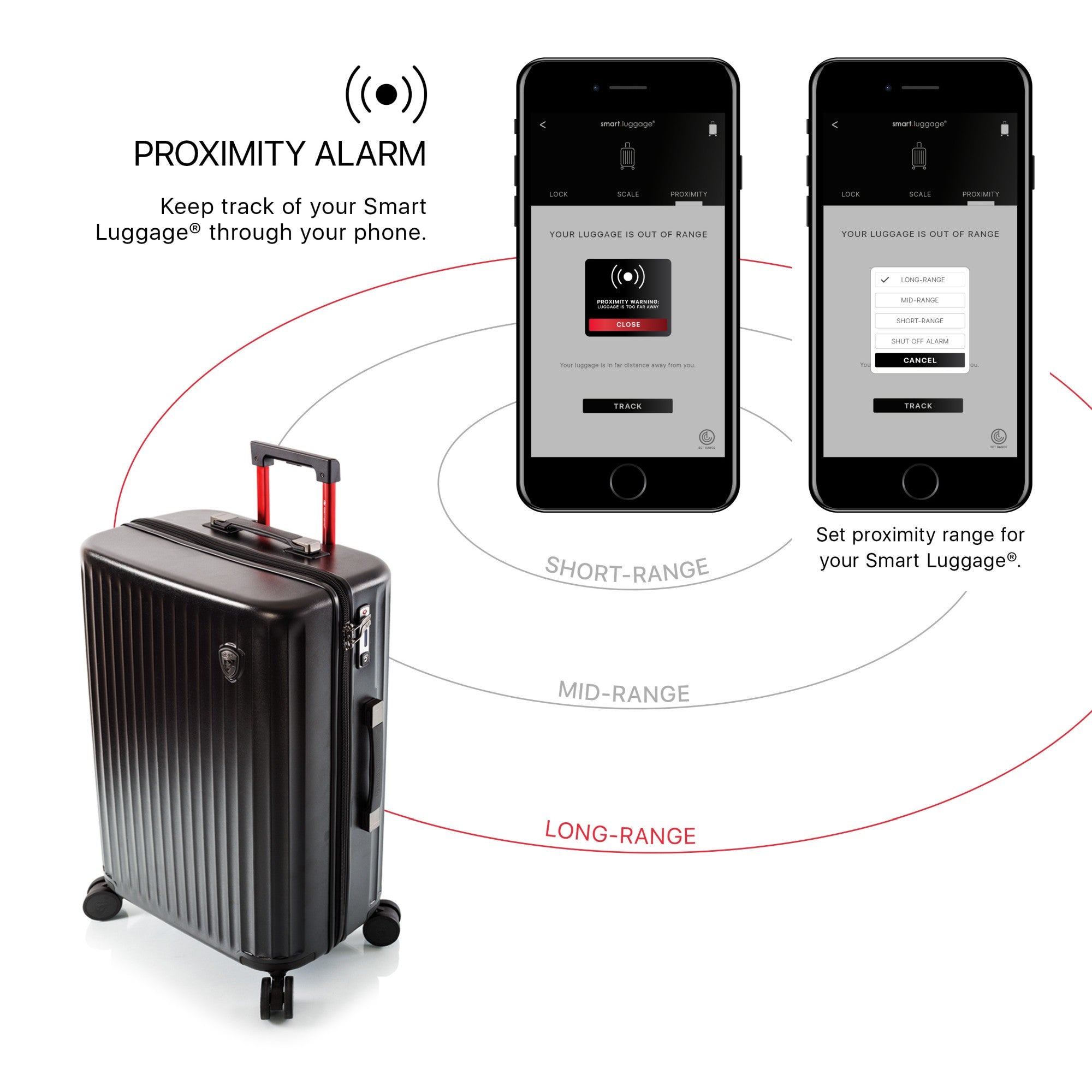 - Proximity Alarm that alerts you when you move too far away from your luggage.