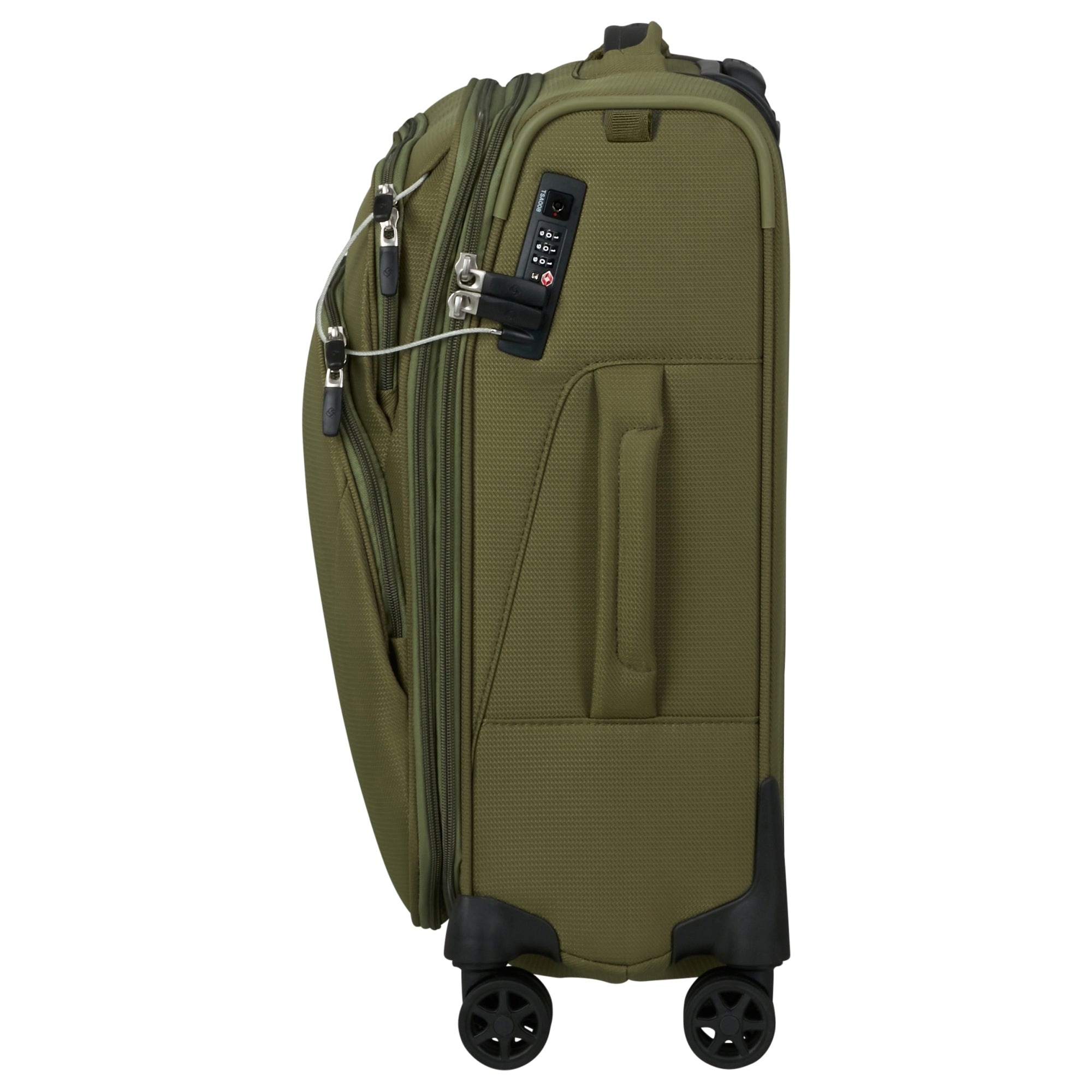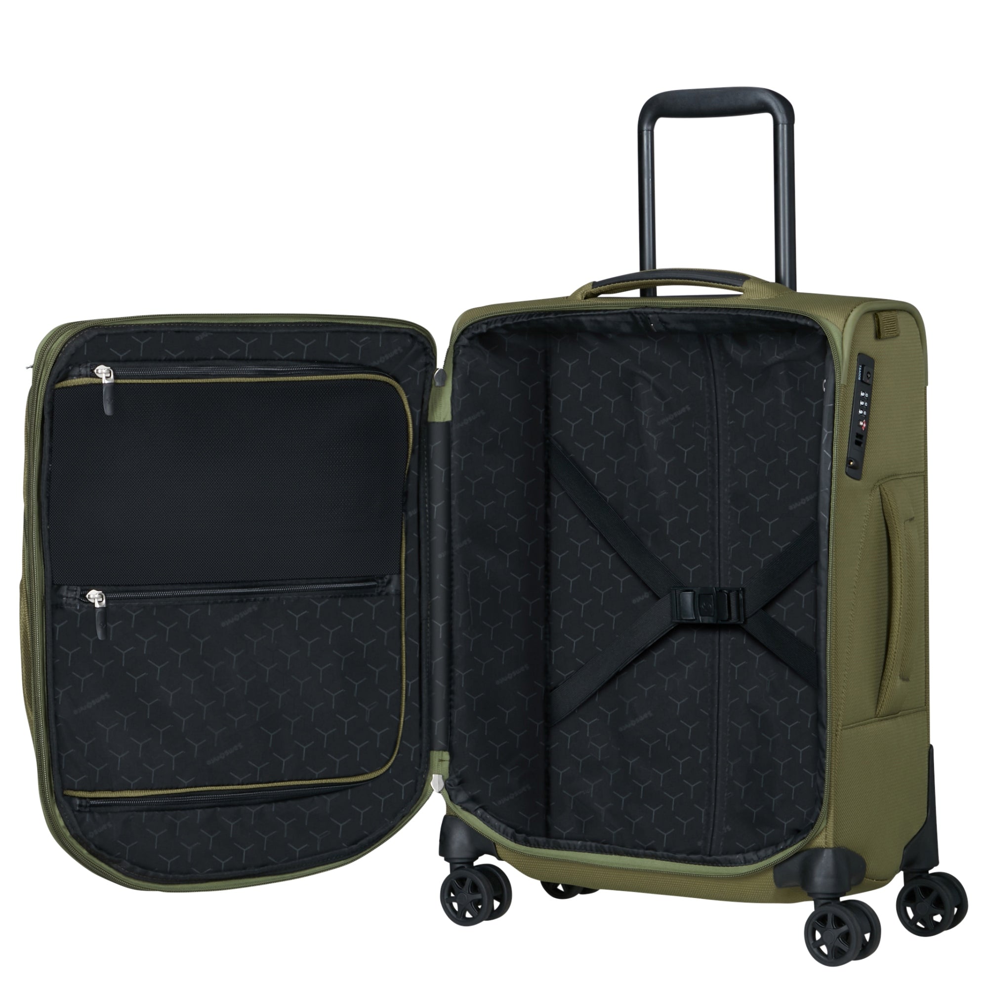 The Samsonite Spark SNG Eco 4-wheel cabin trolley in olive combines sustainability with proven functionality. With a volume of 48 liters and a weight of 2.7 kg, this trolley is ideal for short trips and business travel.