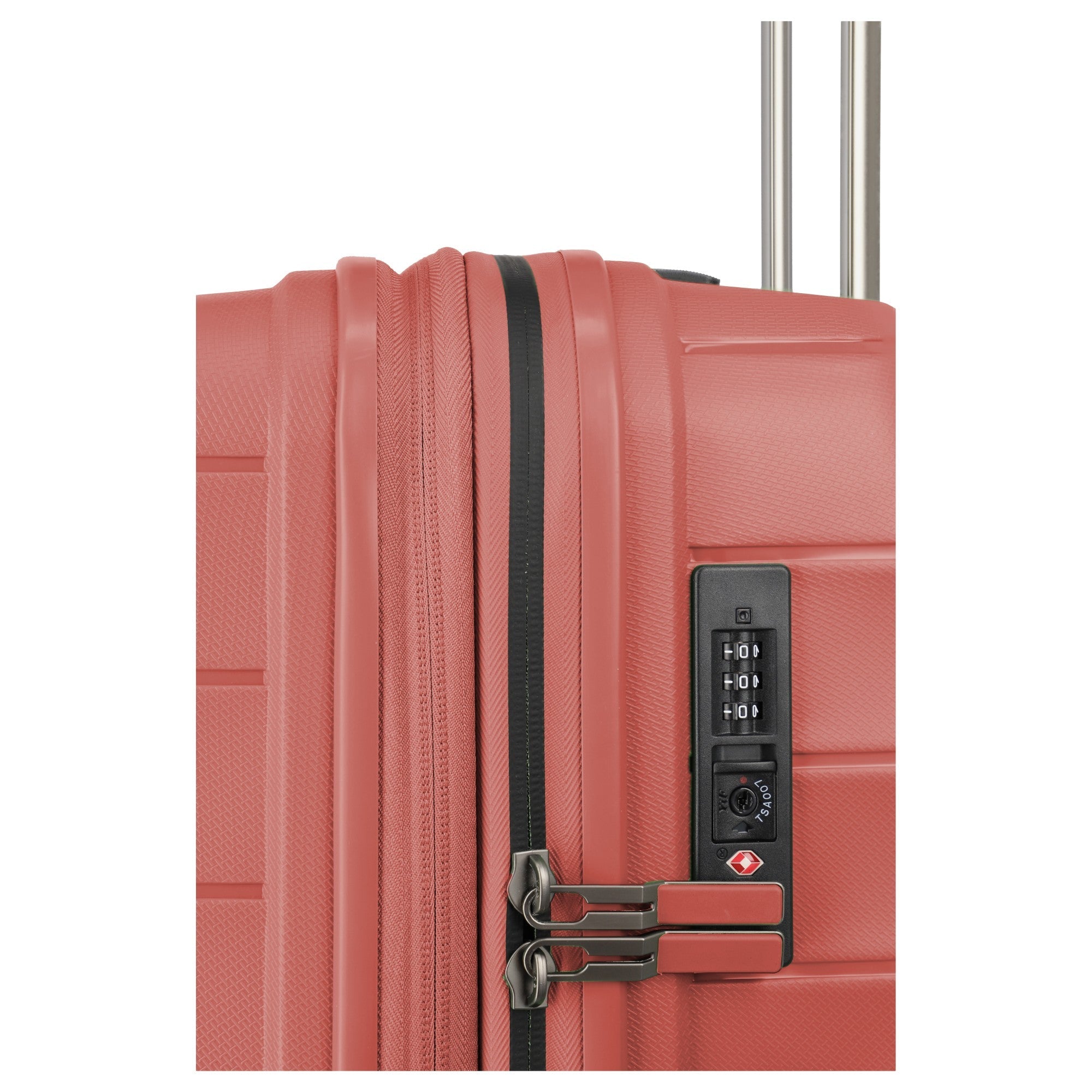 The Travelite Mooby 4-wheel trolley M in vibrant red is a functional companion for medium-length trips. The sturdy case made of polypropylene, produced from Ocean-Bound Plastic, combines sustainability with durability. With a size of 66 cm and a weight of 3.4 kg, it offers ample storage space for your travel essentials.