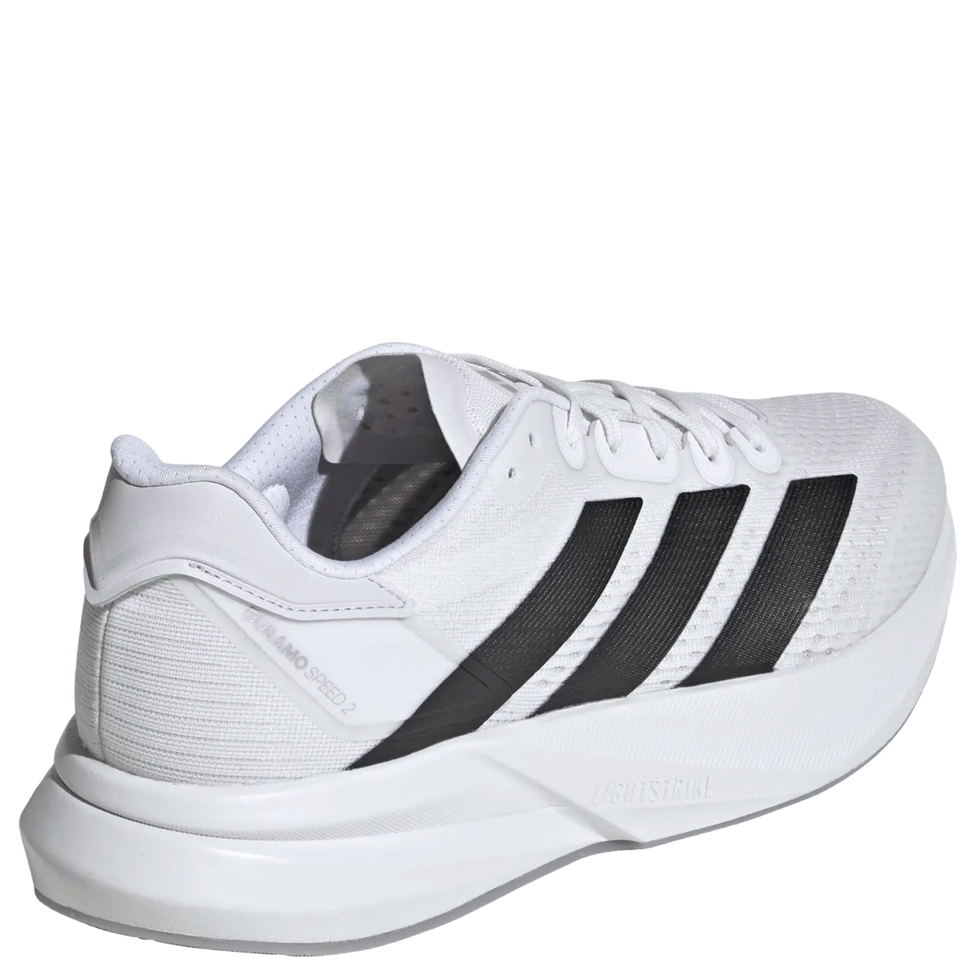 Der adidas Duramo Speed 2 M ist ein leichter Laufschuh in klassischem Weiß mit markanten schwarzen Streifen, der Komfort und Stil für sportliche Aktivitäten verbindet.