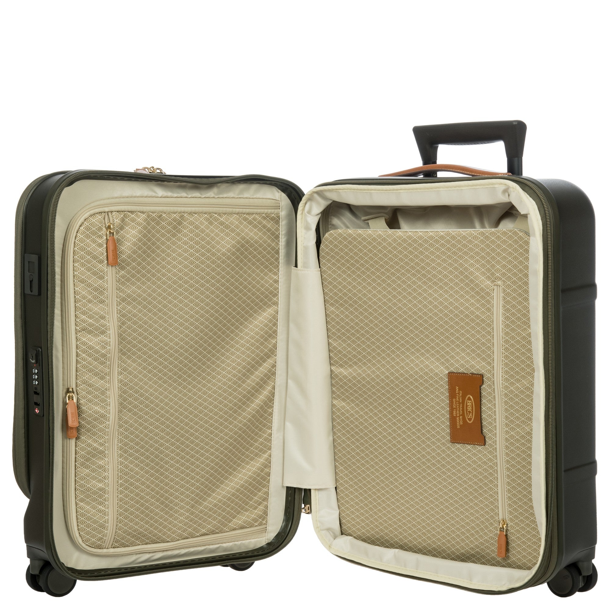 Der Brics Bellagio 4-Rollen-Kabinentrolley besticht durch eine Kombination aus Funktionalität und nachhaltigem Design. Das Modell in Olive ist aus recyceltem Polycarbonat gefertigt und mit eleganten ledernen Applikationen versehen, die dem Trolley eine dezente, hochwertige Optik verleihen.