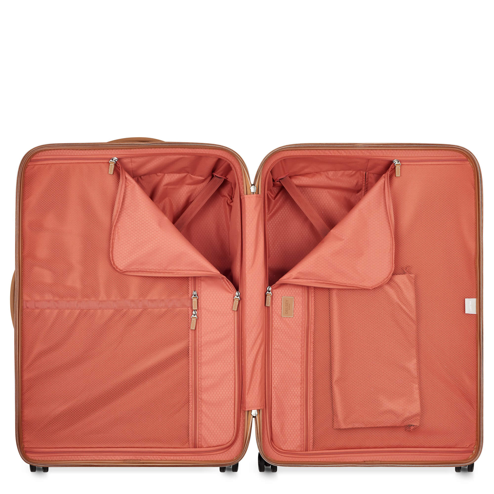 Ein robuster 4-Rollen-Trolley von DELSEY Paris, der mit seinem großzügigen Volumen von 132 Litern ausreichend Platz für Kleidung und Reiseutensilien bietet. Die elegante Kombination aus dunklem Braun und kontrastierenden Details unterstreicht die hochwertige Verarbeitung.