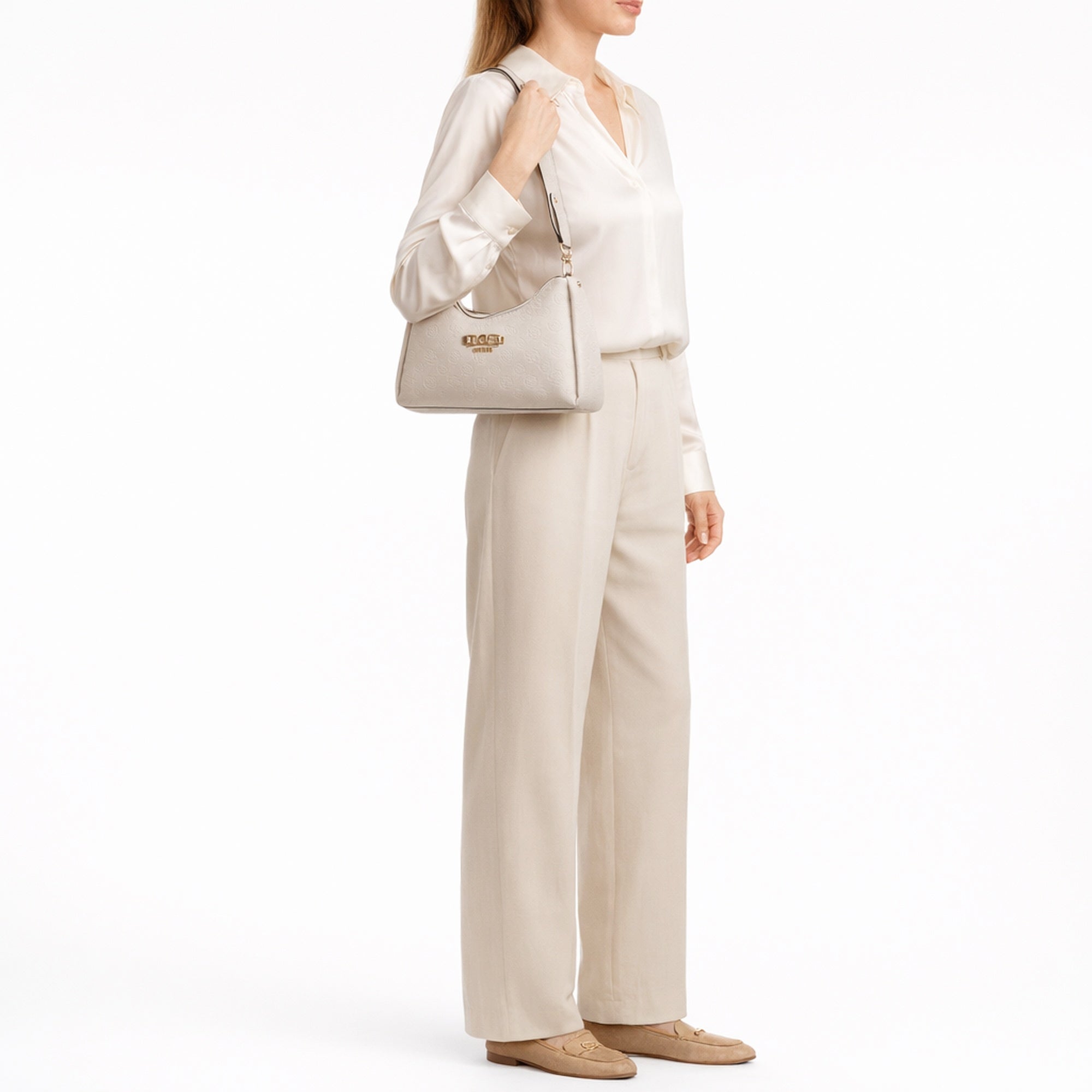 Ein modisches Accessoire, das Stil und Funktionalität harmonisch verbindet – die Guess Anise Double Zip Schultertasche in elegantem stone logo.