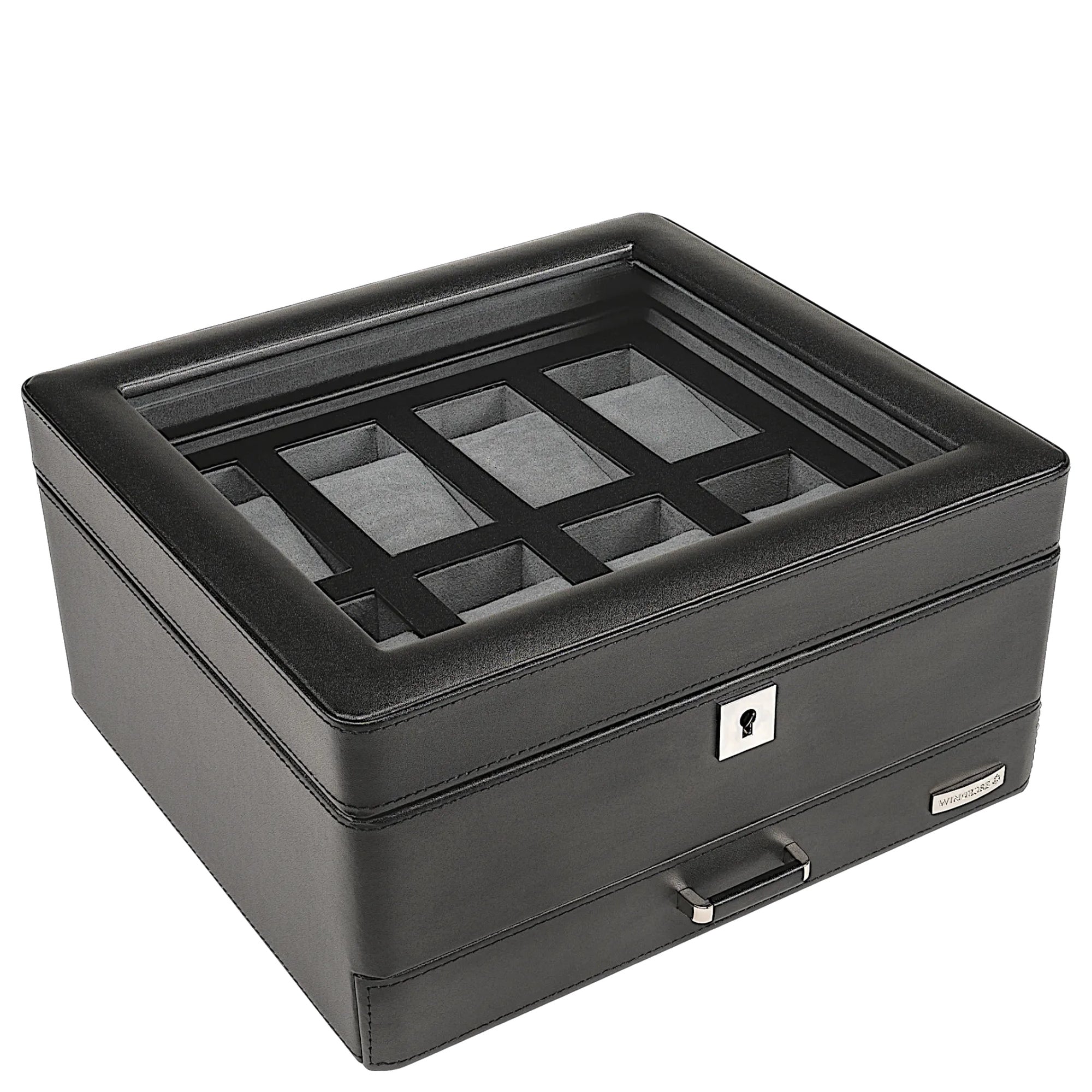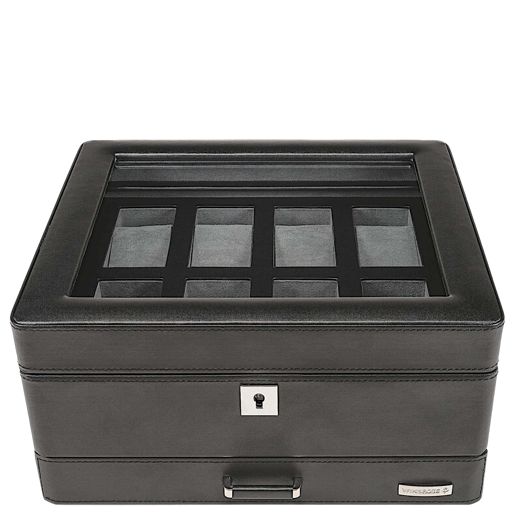 Die Windrose Tempora Uhrenbox in elegantem Schwarz bietet eine sichere und stilvolle Aufbewahrung für bis zu 8 Uhren. Das funktionale Design kombiniert hochwertige Verarbeitung mit praktischen Details für Uhrenliebhaber.